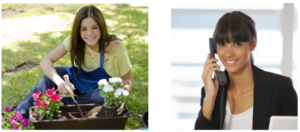 The first picture depicts a young girl working in a garden outside. The other picture shows a woman calling on the phone. Probably, she’s at work in an office because she seems to be dressed formally.