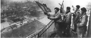 Советские солдаты П. Мимин, А. Фомин, С. Тушканов и А. Базаров водружают красный флаг над освобождённым от немецко-фашистских захватчиков городом Гатчина (Ленинградская область), 26 января 1944 г.