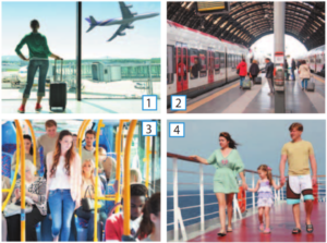 Describe the pictures. How are the people in each picture travelling? Which means of transport do you prefer?