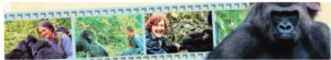 The pictures show a woman closely interacting with gorillas in a lush, green jungle environment. In the first few frames, she is sitting and observing the gorillas at a very close distance, showing a calm and respectful attitude towards these animals.