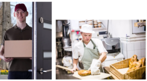 The first picture depicts a young boy who is standing near the door and carrying a box. The other picture shows a boy baking bread in a kitchen, possibly in a restaurant.