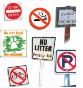 Write sentences to explain what each sign means. Use modals and the following verbs: feed, fish, smoke, park, litter, ride, turn, enter.
