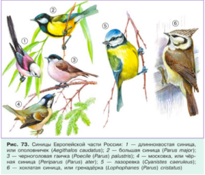 В Центральной России обитает шесть близких видов синиц (рис. 73). Определите пищевые предпочтения каждого вида и ответьте на вопрос: эти виды синиц занимают одну или разные экологические ниши? Свой ответ обоснуйте.