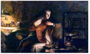 Дж. Уатт с моделью своей паровой машины