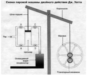 Схема паровой машины двойного действия Дж. Уатта