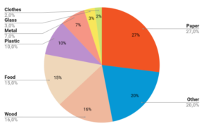 Paper is the largest component, making up 27% of the total rubbish. Other materials account for 20%. Wood and food waste are also significant, at 16% and 15% respectively. Plastic makes up 10%, while metal is 7%. Glass and clothes are the smallest portions, at 3% and 2%.