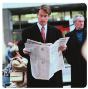 Describe the picture. What is the man reading: a tabloid (short articles, lots of pictures) or a broadsheet (larger, longer articles, more serious)? Do you have both of these types of newspapers in your country?