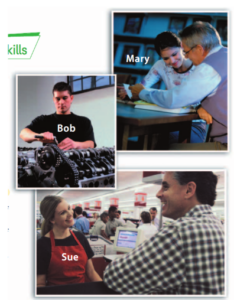 Describe the pictures. Who: works as a cashier? Is at university? Is training to be a mechanic?
