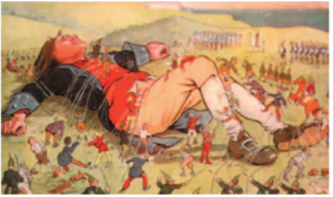 - The picture depicts a giant man lying on the ground. His size is emphasized by the very small people who are swarming around him. Some appear to be tying him down with ropes, while others seem to be soldiers standing at attention in the background.