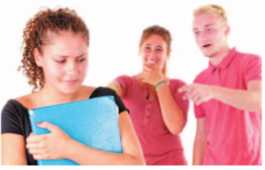 The person is upset and under pressure because she is being bullied by her peers. It appears that the two people in the background are laughing at or making fun of the person in the foreground. Their body language and expressions suggest ridicule.