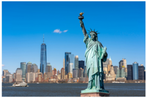 The monument in the picture is the Statue of Liberty, located on Liberty Island in New York Harbor, USA. It is a gift from France, representing freedom and democracy.