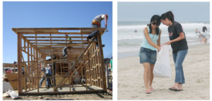 In these two photos, we can see young people helping improve the community. 1) Both of the activities are taking place outdoors. The girls in the first picture seem to be involved in a beach clean-up day, 2) while the men in the second picture are building what looks to be a small house. It could be a shelter for the homeless, or a house for people who have lost their home in a natural disaster. What the pictures have in 3) common is that they show volunteer activities. 4) However, picking litter from the beach litter from the beach seems a less physically demanding activity. Judging by the girls’ smiles, it looks like a more enjoyable activity 5) as well. 6) In contrast, constructing a house requires hard physical labour and it 7) also takes much more time to build a house than to clean a beach.